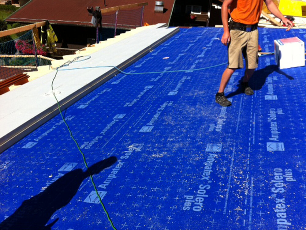 • Dreilagige Dampfbremse, Luftdichtung und Schalungsbahn